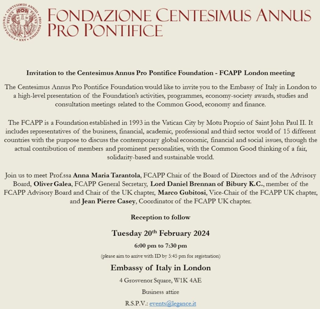 20 febbraio 2024: Workshop “Living, Implementing, and Teaching Catholic Social Thought” ed Evento Ambasciata d’Italia a Londra