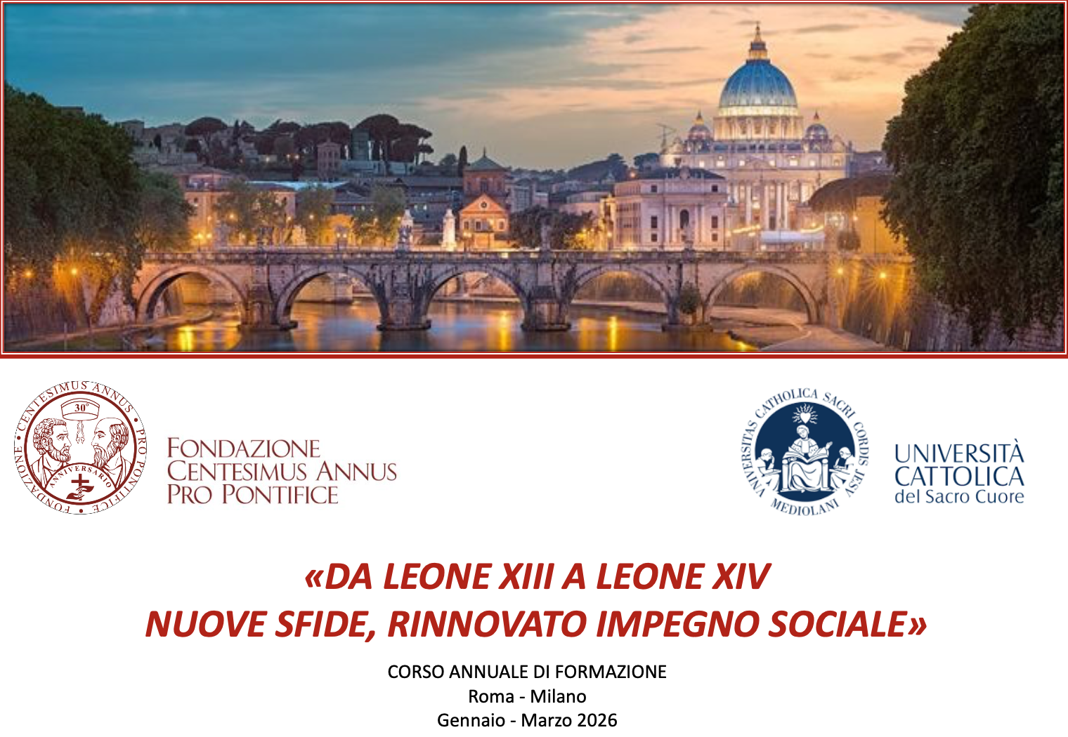 “Da Leone XIII a Leone XIV. Nuove sfide, rinnovato impegno sociale” è il tema dell’edizione 2026 dell’annuale corso di formazione in Insegnamento Sociale della Chiesa, promosso e organizzato da tanti anni, dalla Fondazione Centesimus Annus Pro Pontifice. I campi di riflessione culturali, sociali, politici ed economici compongono una realtà in continuo movimento. Le società contemporanee si trovano oggi ad affrontare sfide sempre più complesse: dalle trasformazioni tecnologiche e bioetiche alle crisi ambientali ed economiche, fino alle nuove domande di pace, di giustizia e di fraternità universale. Il corso di formazione in Insegnamento Sociale della Chiesa intende affrontare queste sfide, favorendo un dialogo fecondo tra la riflessione accademica e l’esperienza concreta dei partecipanti. Quest’anno, per la prima volta, il Corso si sviluppa in due sedi: Roma e Milano. Sono previsti infatti tre incontri a Roma e due a Milano, presso l’Università Cattolica del Sacro Cuore. Si tratta di una novità importante, che arricchisce il percorso formativo grazie al contributo di due contesti culturali ed ecclesiali complementari, offrendo ai partecipanti l’opportunità di vivere un’esperienza ancora più ricca e diversificata.