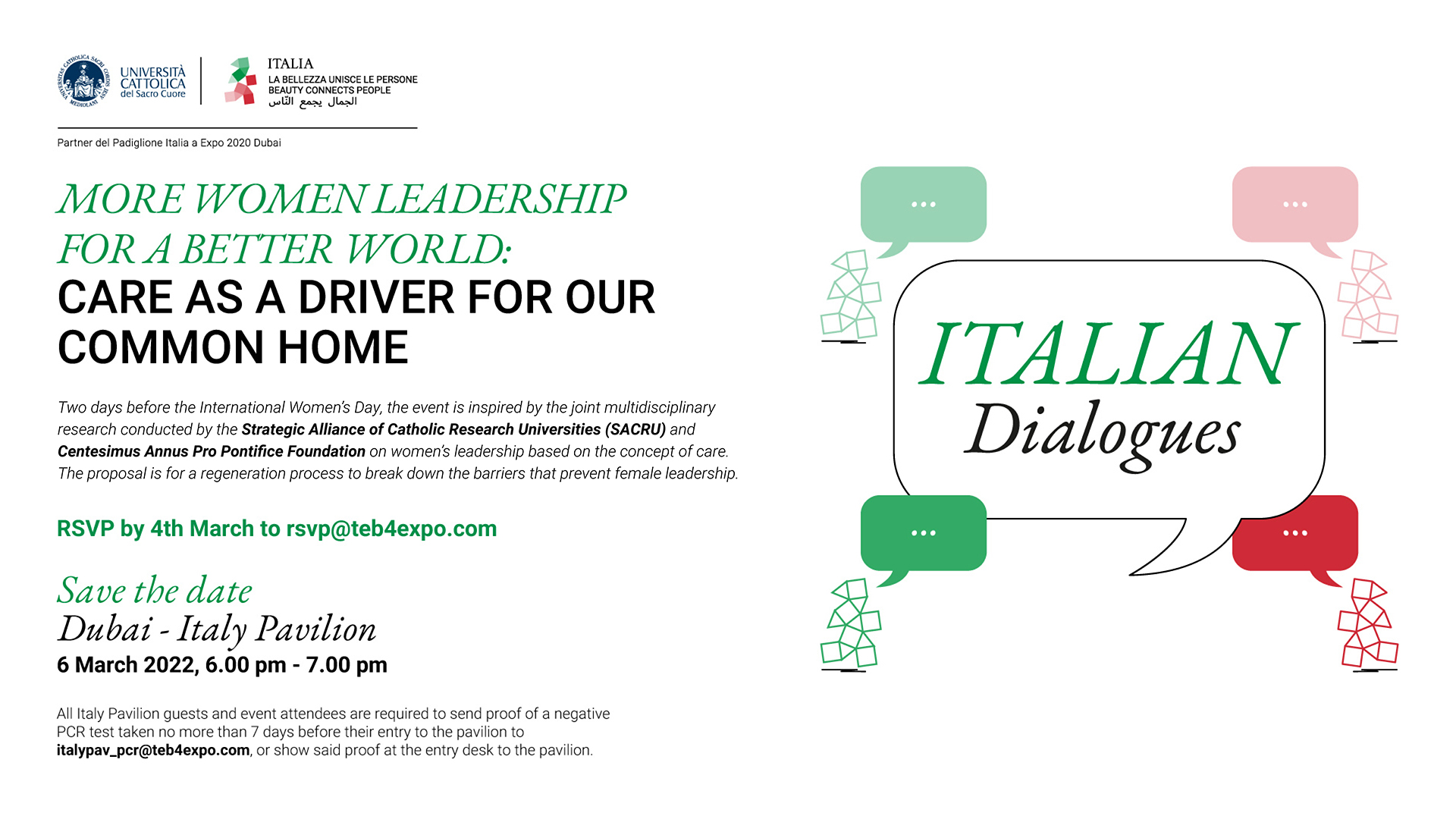 “More Women Leadership for a Better World: Care as a Driver for Our Common Home” previsto per il prossimo 6 marzo presso il Padiglione Italia a Expo Dubai alle ore 18.00 locali (ore 15.00 in Italia). L’evento sarà in diretta streaming sulla pagina Youtube e Facebook di Italy Expo 2020 oltre che sui social network di Università Cattolica (Facebook, LinkedIn, Youtube).